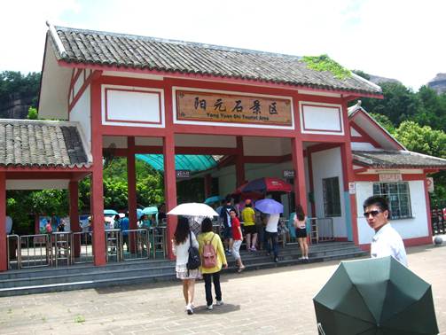 經過三個半小時的車程,中午時分,終于來到了丹霞山景區。下車的時候,雨霽天晴,飽餐一頓后,迫不及待的,涂防曬霜,噴蚊怕水,撐太陽傘、穿防曬衣、帶帽子、太陽眼鏡,防曬防暑的裝備一應俱全,在大家整裝后,我們開始朝著第一個目的地——元陽石風景區出發!