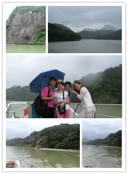 參觀完了元陽石風景區,接下來就是“錦江游船”了,坐在游船上,欣賞著 “錦江畫廊”,大雨忽至,卻一點都不影響大家游玩的心情,隨著船上導游風趣的講解,同事們這邊跑,那邊轉的,相機沒有一刻停歇,丹霞美景集中展現,金龜朝圣、鯉魚跳龍門、、六指擒魔、觀音送子、笑面佛、茶壺峰、拇指峰、仙山瓊閣等美景點綴兩岸,目不暇接,群峰呈態,妙不可言,當然,這個也要考大家的眼力和想象力了。